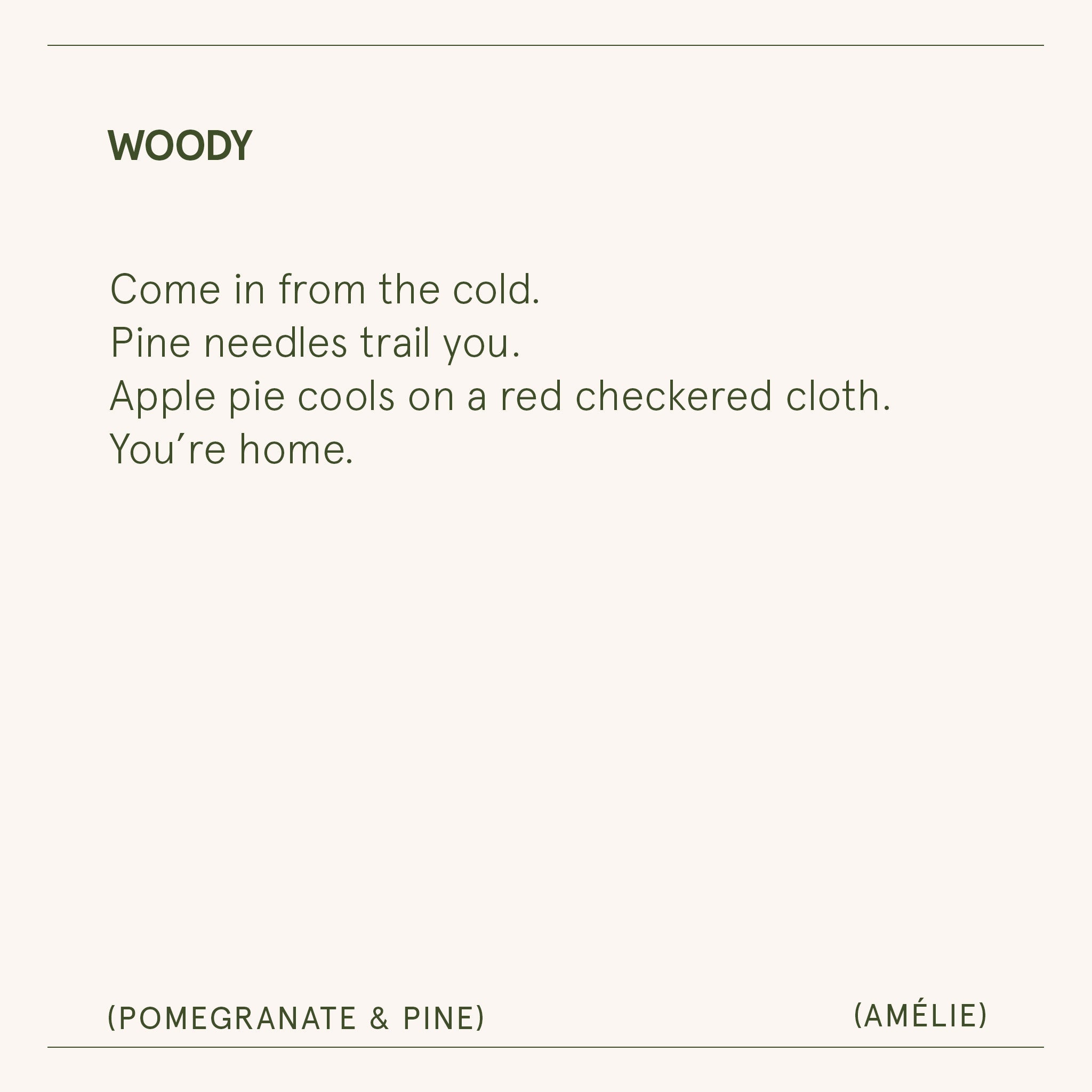 Bright and cozy, the Amélie Pomegranate & Pine Candle layers sweetness of ripe pomegranate with the invigorating crispness of pine, deepened by warm cedarwood and musk. Ideal for creating a lively and welcoming atmosphere.