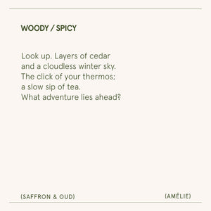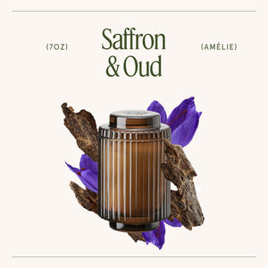 The Amélie Saffron & Oud Candle combines the richness of red saffron and smoky oud, layered with warm amber and fresh cedar. This enchanting fragrance conjures an intimate ambiance, wrapping your space in year-round serenity.