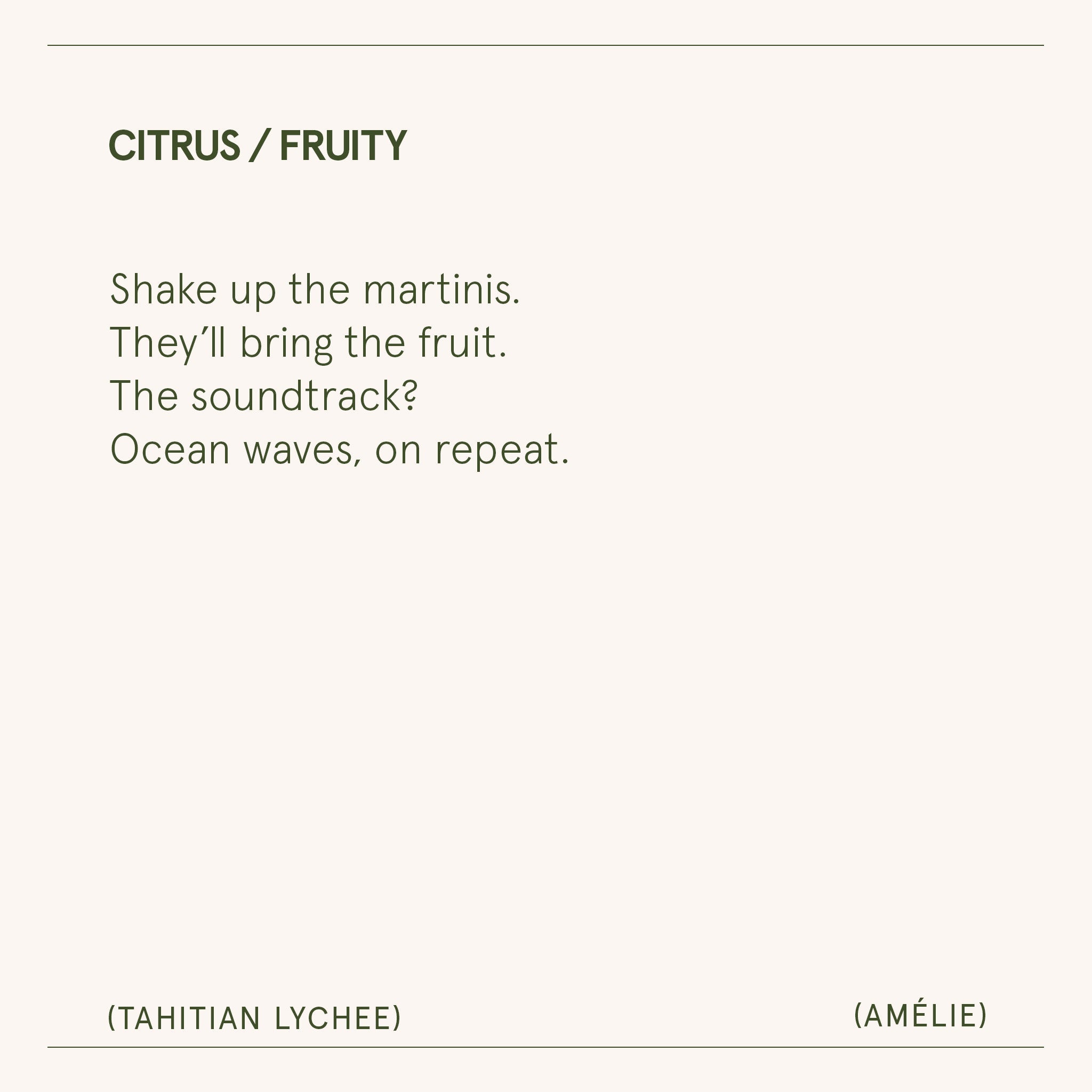 Bring the vibrancy of the tropics home with the Amélie Tahitian Lychee Candle. Bursting with juicy lychee and pineapple, softened by rose and musk, this fragrance inspires energy and joy in every moment.
