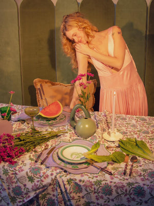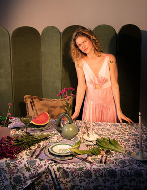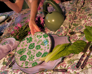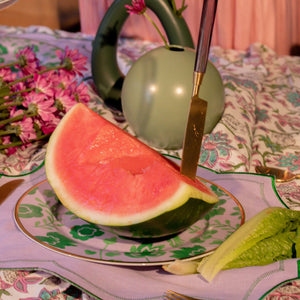 Featuring a pastel lavender backdrop and hand-drawn verdant green bloom and leaf patterns, this dinner plate serves as the perfect companion to our Bernadette Palm Soup Bowl. Encircled with a gold rim.
