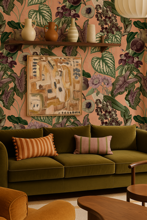 Transform your space into a luxe, tropical paradise with our Cali Tropicale Wallpaper. Designed by Samantha Santana, this peach and green wallpaper features a stunning collage of vintage botanical illustrations. Its versatile installation options - peel and stick vinyl or traditional pasted - make it easy to customize and remove. Elevate your decor today.