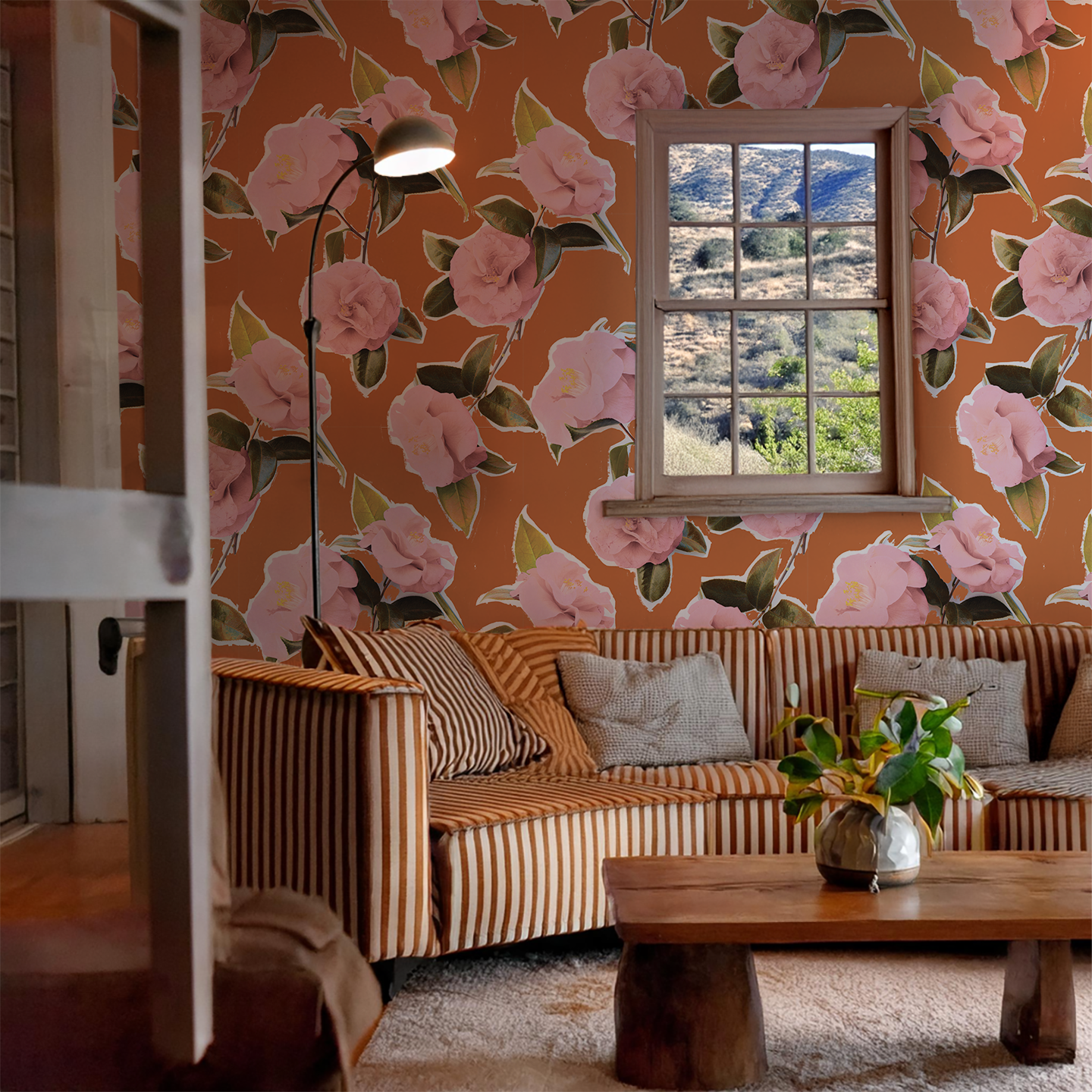 Transform your space with the beautiful Camellia Wallpaper, designed by artist Samantha Santana. The intricately detailed artwork is created from photos of camellias picked straight from her backyard. With both peel and stick vinyl and traditional pasted options, installation is a breeze. Plus, the wallpaper is completely removable, making it a versatile and easy choice for any room.
