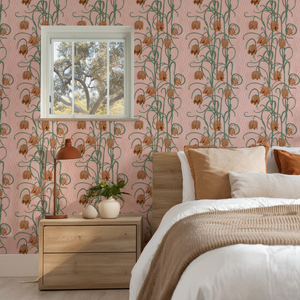 Enhance your living space with the unique blend of dusty pink, green and orange tones. The Campanas Wallpaper features a modern twist on classic floral patterns and stripes, illustrated by Samantha Santana. Not only does this wallpaper add visual appeal, it's also incredibly easy to install. Bring beauty and convenience to your home decor with Campanas Wallpaper.