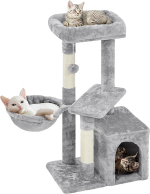 Solid Particleboard & Sisal RopeOur cat tower is mainly constructed of solid particleboard and plush and sisal ropes. This free-standing cat tree has no hazardous substances to your cats and families. | Plush FabricWell-furnished , this cat house is suitable for several kittens or one normally-sized adult cat, not suitable for large-sized cats. | Stable StructureHigh-quality particleboard ensures safety and stability while the cat is jumping or playing. |