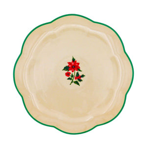Set against a nostalgic cream canvas, a dainty cluster of seasonal red blooms, complemented by verdant leaves and petite berries, graces the center, evoking treasured holiday heirlooms from yesteryears. A botanical green rim accentuates its scalloped silhouette, perfect for intimate holiday gatherings and reminiscing over cherished memories. Pair with its matching dinner plate for a harmonious tablescape.