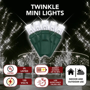 Elevate your decor with 5mm Pure White Twinkle LED Mini Lights on Green Wire. Each box includes 25 strands of 50 lights with 6-inch spacing, perfect for creating a serene and festive atmosphere for any occasion.