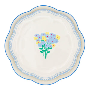 Sporadically sprinkled bouquets of periwinkle and sunflower-yellow blossoms, reminiscent of a meadow in full bloom, finished with a pastel blue scalloped rim, evoking hints of classic Italian and French ceramics. It's a modern nod to beloved European styles, perfect for the main course.