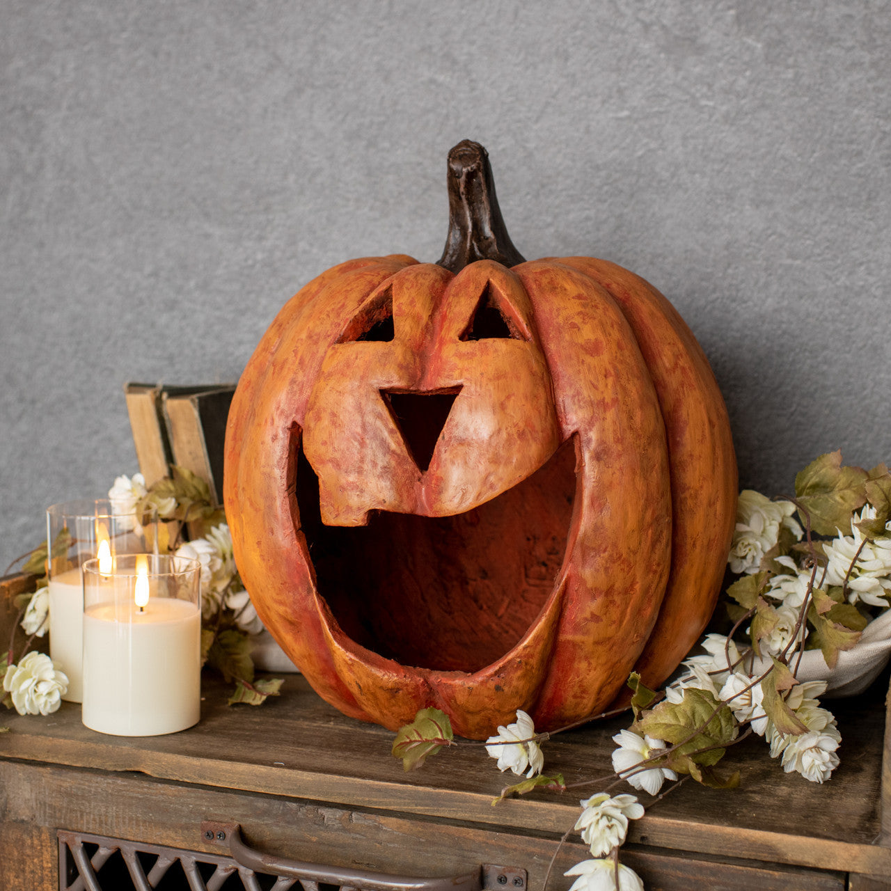 Elevate your Halloween decor with our Orange Big Mouth Pumpkins! Inspired by vintage designs, these pumpkins boast a one-toothed big mouth and triangle eyes and nose. Upgrade your fall decor with these charming pumpkins.