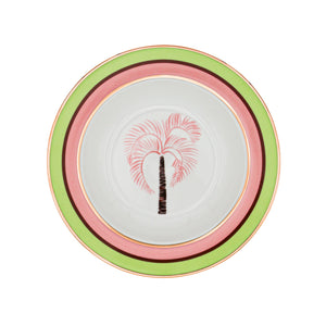 Dive into a dreamscape of yesteryears every time you indulge in your favorite soup or pasta. This bowl boasts a hand-painted blush palm tree and chocolate brown stem, intricately illustrated as if swaying with the breeze. Gold outer rim complemented by inner rings of pistachio, blush, and chocolate brown encircle the bowl edge. Designed for the contemporary soul who cherishes throwback aesthetics.