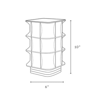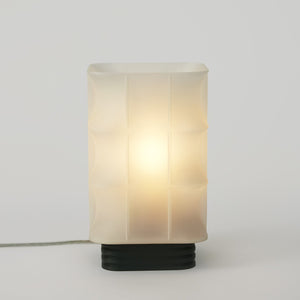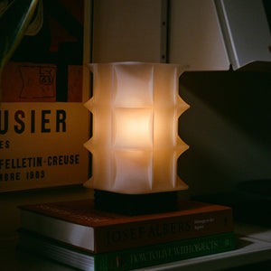 Designed in collaboration with Nigh Collective, the Scaffold Lamp takes inspiration from paper lanterns, emulating the effect of a grid cage tightly wrapped in paper. This allows for it to juxtapose the repetitive, structured pattern with playful curves, present in the shade on a large scale and mirrored on the base in a smaller, convex form.