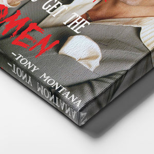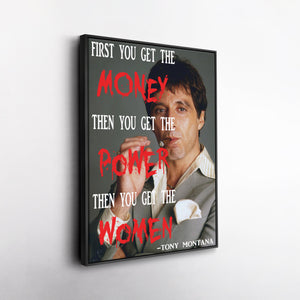Add ambition and cinematic swagger to your walls with this Scarface Quote Canvas Art – “First You Get the Money…” Tony Montana Wall Decor. Featuring the iconic quote, “First you get the money, then you get the power, then you get the women,” this striking canvas captures the ruthless philosophy of Tony Montana and the unforgettable attitude of Scarface.
