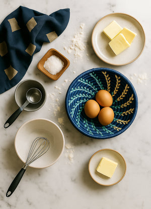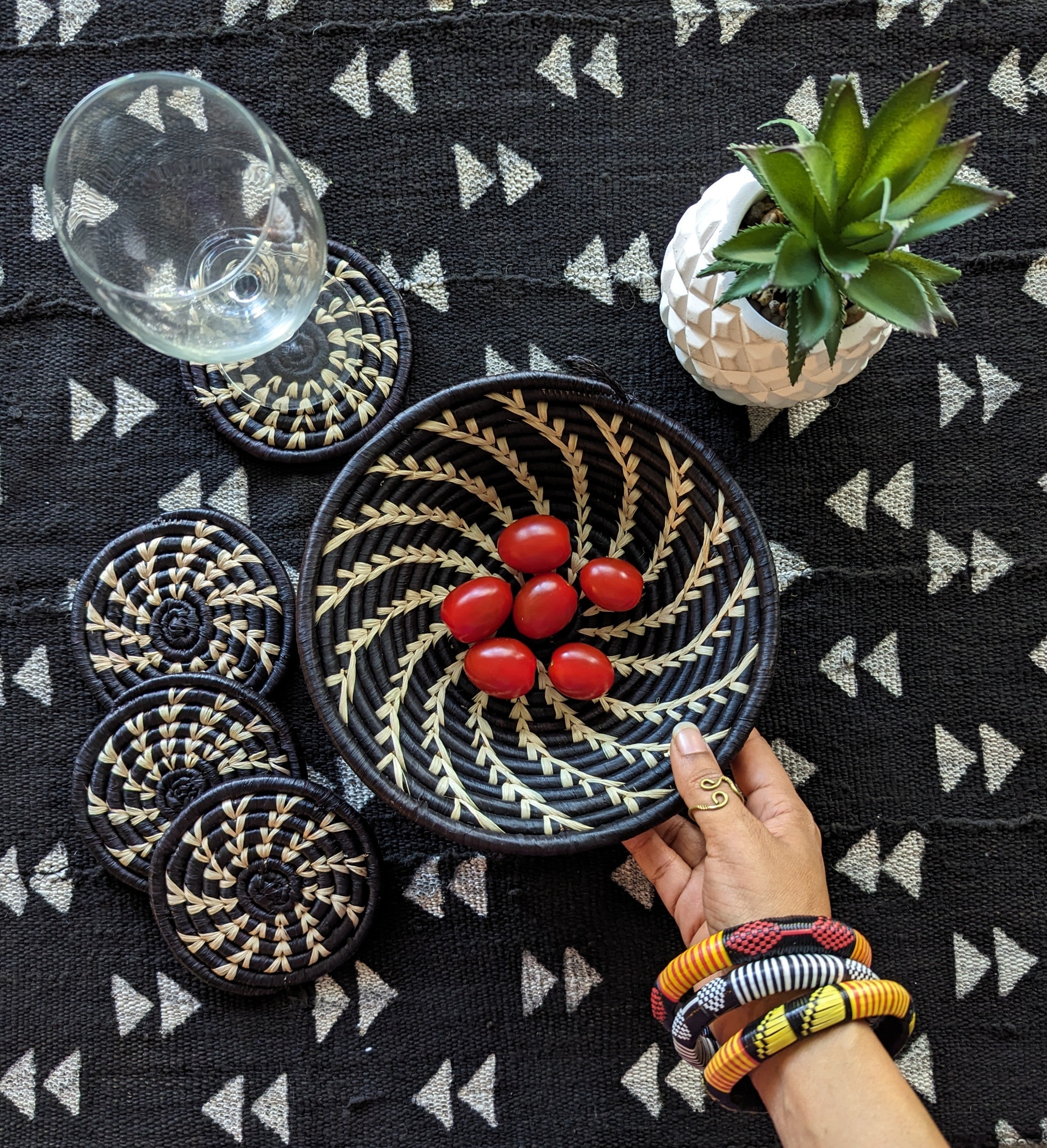 Our small woven raffia baskets, handcrafted in Uganda, offer a vibrant and functional accent for any space.