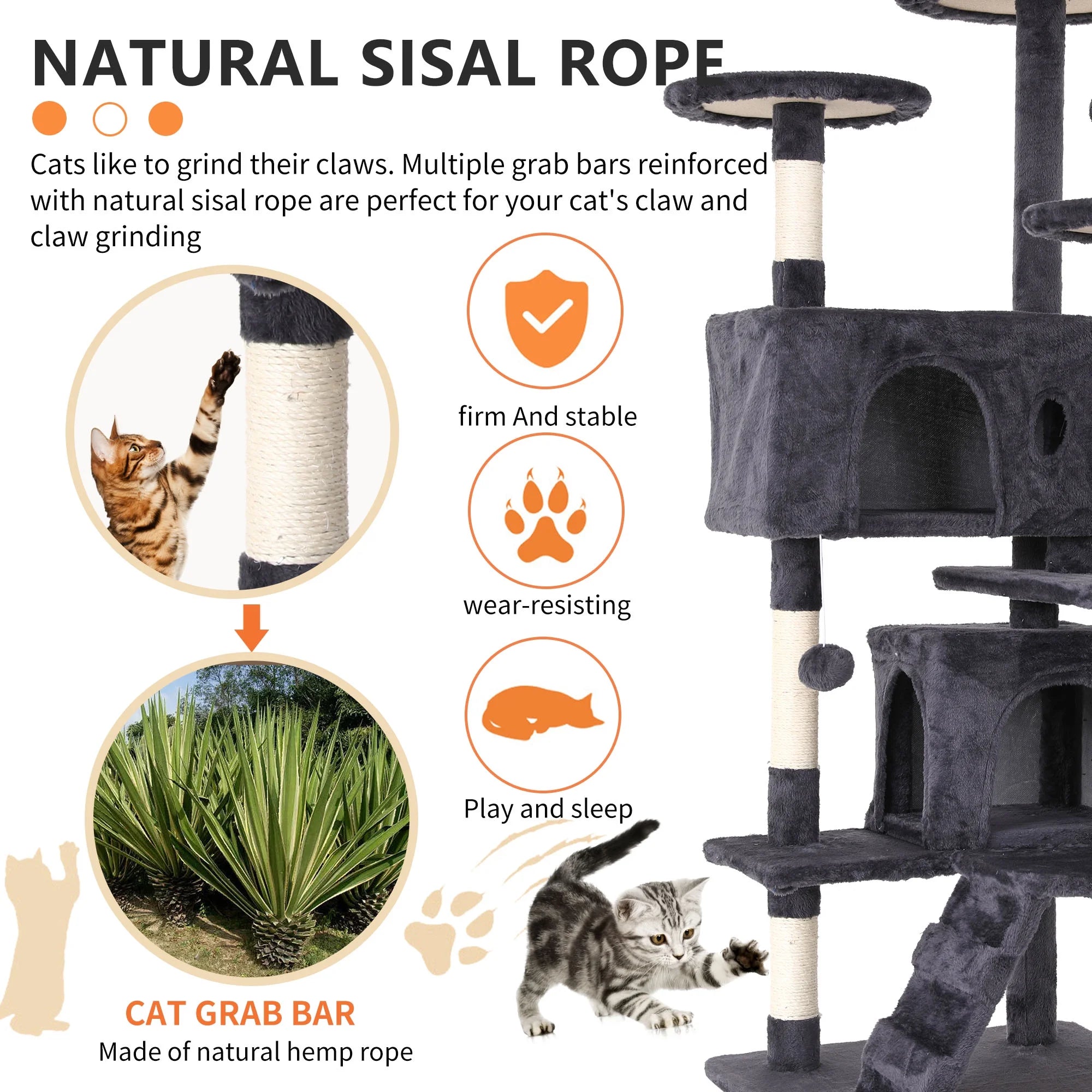 - š»ćProtects Your FurniturećThis compact cat furniture is composed of good quality particle board with polyester covering, which is very modern and comfortable. Multiple scratching posts are covered by 100% natural sisal ropes which are perfect for your cats to scratch and climb, not scratching your furniture anymore. kitty tower indoor cat house cat tower with scratching post