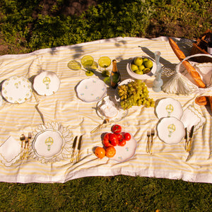 The Valensole Lavender Starter Plate encapsulates the essence of a dreamy afternoon in Provence with varying-sized hand-drawn hot air balloons in green and yellow hues with a muted green scalloped rim. Surrounding the edge, sprigs of yellow blossoms punctuated with verdant leaves evoke memories of the sun-kissed lavender fields of Valensole, reminiscent of lazy afternoons in the French countryside.