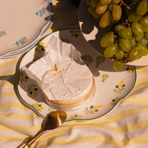 The Valensole Lavender Starter Plate encapsulates the essence of a dreamy afternoon in Provence with varying-sized hand-drawn hot air balloons in green and yellow hues with a muted green scalloped rim. Surrounding the edge, sprigs of yellow blossoms punctuated with verdant leaves evoke memories of the sun-kissed lavender fields of Valensole, reminiscent of lazy afternoons in the French countryside.
